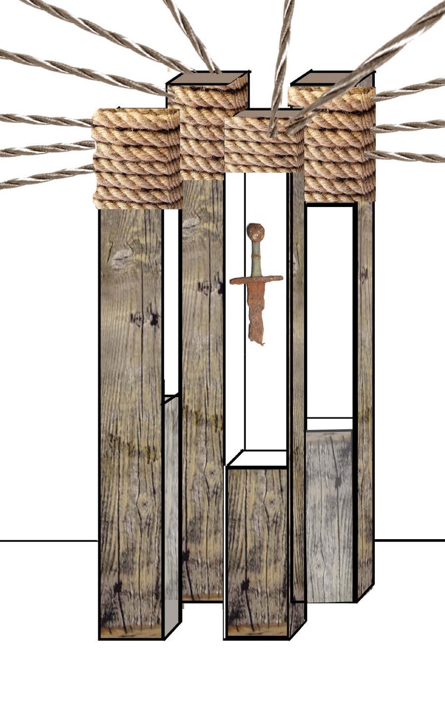 Поскольку все заявленные темы — это разные стороны жизни одного народа, в центре зала установлен общий объект: 4 столба-витрины, каждый по своей теме. Внутри витрины размещен «ключевой» экспонат, вскрывающий проблематику блока. От столбов к тематическим модулям, размещенным по периметру зала натянуты (выше человеческого роста) веревки. По периметру зала в указанной выше последовательности тематические модули.