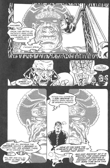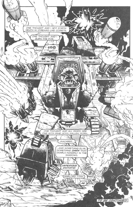 Комикс Дэна Абнетта Titan вышел том же сборнике в 1999 году и повествует про Хекате — командира боевой машины — титана Imperius Dictatio. Он одержим победой, так как в прошлом потерял в битве всю свою команду. В конце истории ради победы он теряет остатки человечности и разум его навечно остается в титане, как дух машины. Еще одна история про самопожертвование ради высшей цели. И такое не редкость в этом мире, ведь здесь государство стоит превыше человека, а за любое неповиновение ждет учесть хуже смерти. Такая безысходность вездесуща в мире Warhammer.