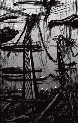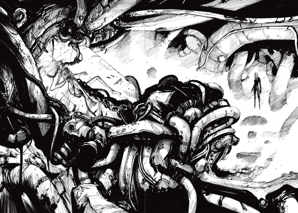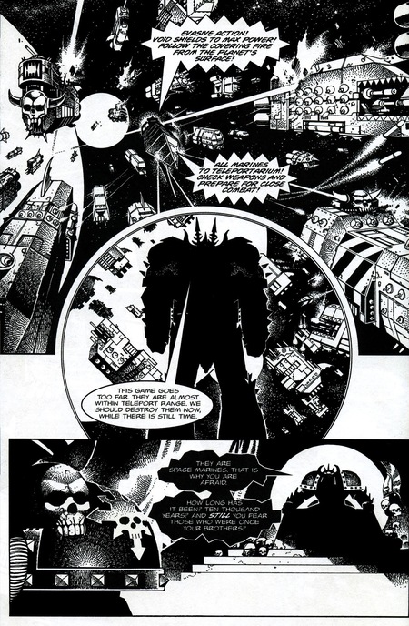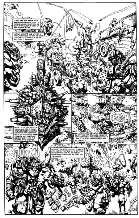 Орки известны тем, что собирают все свое обмундирование и арсенал из груд металлолома, а мышление и логика у них, так сказать, интересная. И это отлично передается через визуал этого комикса. Линии, нарисованные от руки и разной толщины погружают в этот хаос происходящего, где надо постараться, чтобы разглядеть, что происходит на картинке. Эта работа сильно отличается от остальных из-за своей несерьезности во всем, но не сбавляет темпы в масштабе и милитаристичности этого мира.