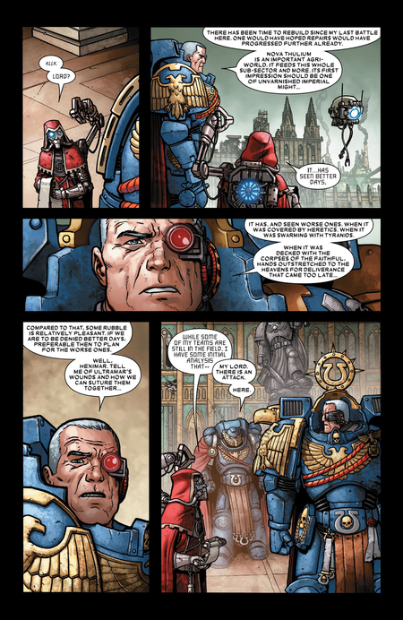 В 2020 году Games Workshop заключили партнерство с Marvel, и те начали выпускать комиксы под своим брендом и это сказалось на картинке. Комикс Marneus Calgar рассказывает биографию великого мастера Ультрамаринов — самого популярного и продаваемого легиона космодесантов. Сам из себя этот легион представляет идеальных солдат без единого изъяна, и мало того, что это является не таким интересными само по себе, так и комикс не пытается сделать что-то интересное. Картинка выглядит слишком супергеройски, особенно с этим ей помогают синие цвета брони этой фракции. На страницах присутствует кровь, но это не придает им веса или мрачности. А история просто повествует про становление героя. Отчасти в этой идеальности и есть главная фишка Ультрамаринов, но комикс это не делает лучше.
