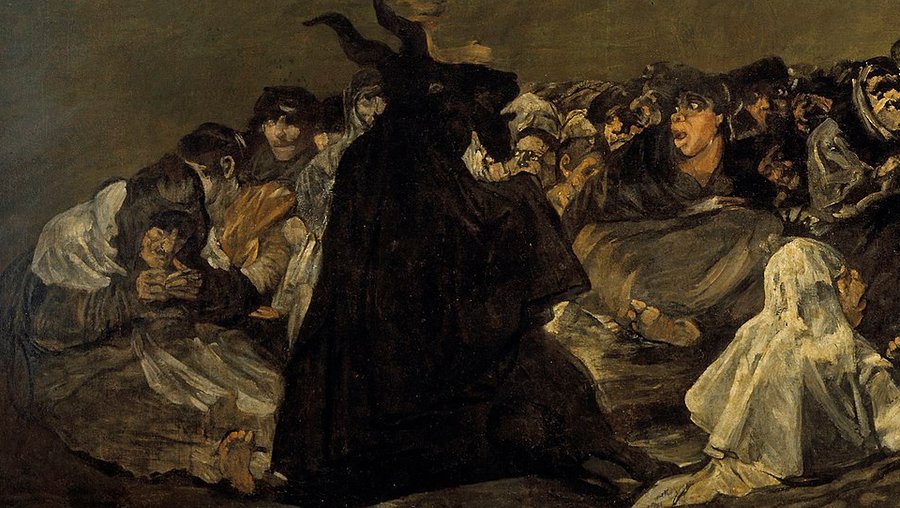 На картине Гойи «Шабаш ведьм» мы видим торжество извращённого сакрального — козлоподобный Сатана восседает на троне, окружённый поклоняющимися ему уродливыми фигурами. Это сознательное, почти театральное зло, где каждый участник добровольно предался тьме.