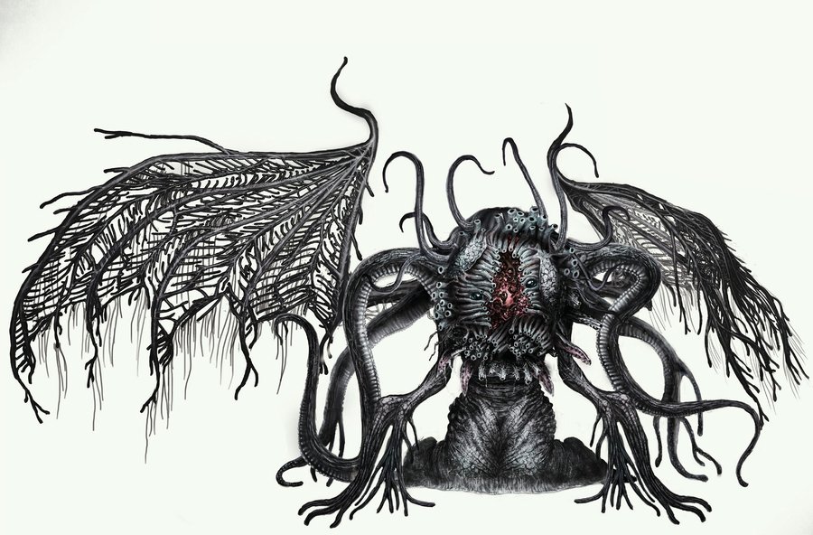 1. Эбраитас — гигантское крылатое существо с щупальцами, полускрытым лицом и телом, покрытым кровавыми узорами. Она напоминает босховских рыболюдей («Искушение св. Антония») и развёрнутых грешников из «Ада», сочетая мученическую позу с инопланетным ужасом.