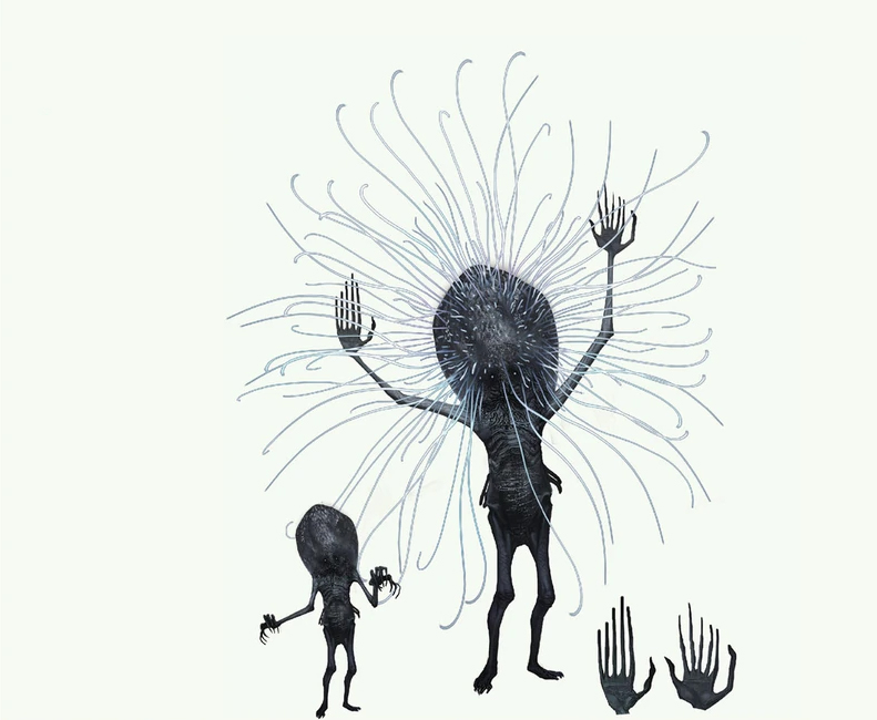 2. Посланники — пухлые, бледные существа с вытянутыми конечностями и головами, напоминающими раздутые мозги или грибы. Они похожи на босховских гибридов людей и растений из «Сада земных наслаждений», пародируя ангелов, но выглядя как мутанты.
