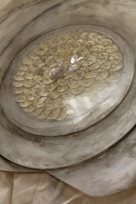 Материалы: семенные створки лунарии, лепидолит, акриловое стекло, пудра горного хрусталя, перламутровый пигмент, мел Размер: 65×70×1,5 см 2025