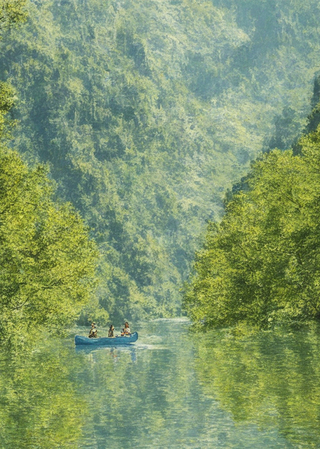 «photo collage in MONE style, Two people in a canoe on a fast-flowing river, surrounded by a mountainous landscape, a bright sunny day, and water sparkling with reflections of the sky and trees»