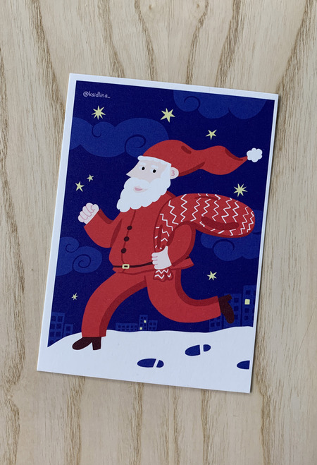 Новогодняя открытка формата А6 с Сантой, который уже спешить вручить вам подарок!