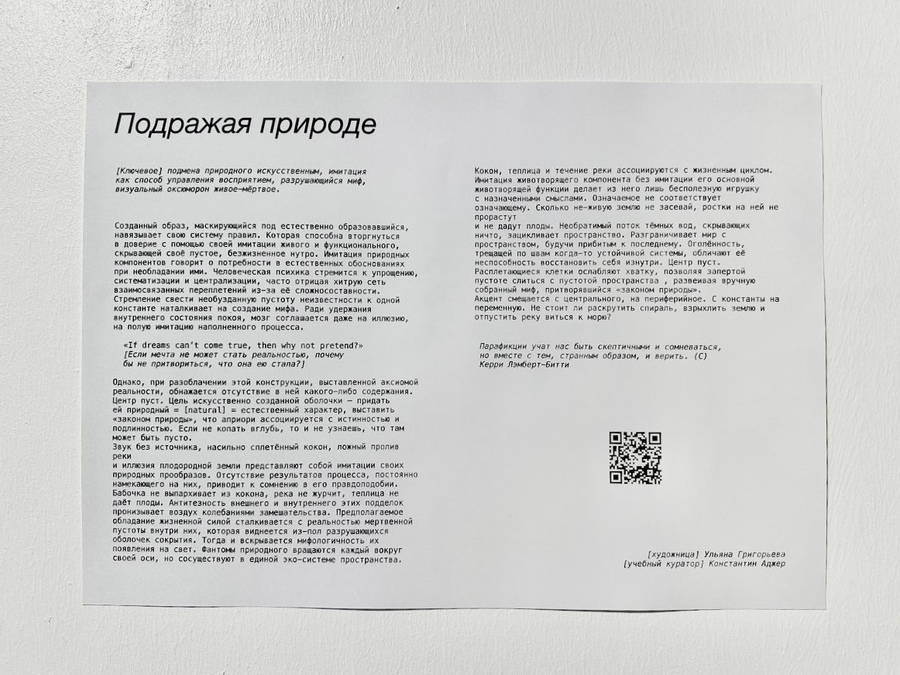 Однако, при разоблачении этой конструкции, выставленной аксиомой реальности, обнажается отсутствие в ней какого-либо содержания. Центр пуст. Цель искусственно созданной оболочки — придать ей природный = [natural] = естественный характер, выставить «законом природы», что априори ассоциируется с истинностью и подлинностью. Если не копать вглубь, то и не узнаешь, что там может быть пусто. Звук без источника, насильно сплетённый кокон, ложный пролив реки и иллюзия плодородной земли представляют собой имитации своих природных прообразов. Отсутствие результатов процесса, постоянно намекающего на них, приводит к сомнению в его правдоподобии. Бабочка не выпархивает из кокона, река не журчит, теплица не даёт плоды. Антитезность внешнего и внутреннего этих подделок пронизывает воздух колебаниями замешательства. Предполагаемое обладание жизненной силой сталкивается с реальностью мертвенной пустоты внутри них, которая виднеется из-под разрушающихся оболочек сокрытия. Тогда и вскрывается мифологичность их появления на свет. Фантомы природного вращаются каждый вокруг своей оси, но сосуществуют в единой эко-системе пространства.