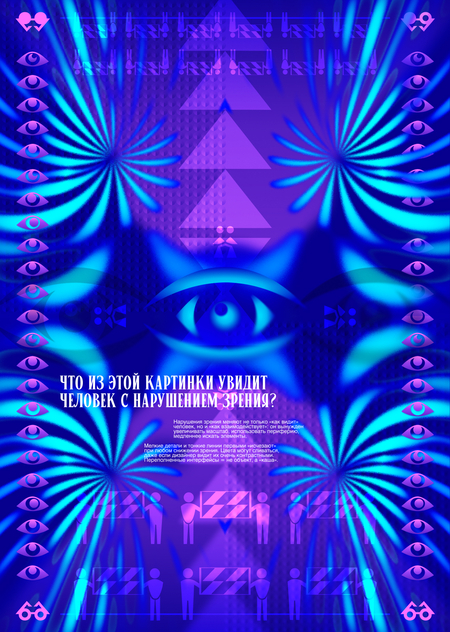 Избыточное количество деталей, орнаментов, бликов и символов в плакате метафорически показывает, что визуальная «красота» часто оборачивается недоступностью: при сниженной остроте зрения или особенностях восприятия эти элементы превращаются в хаотичное «шумовое поле». То, что задумано как эффектный визуальный приём, в реальности может стать препятствием к пониманию.