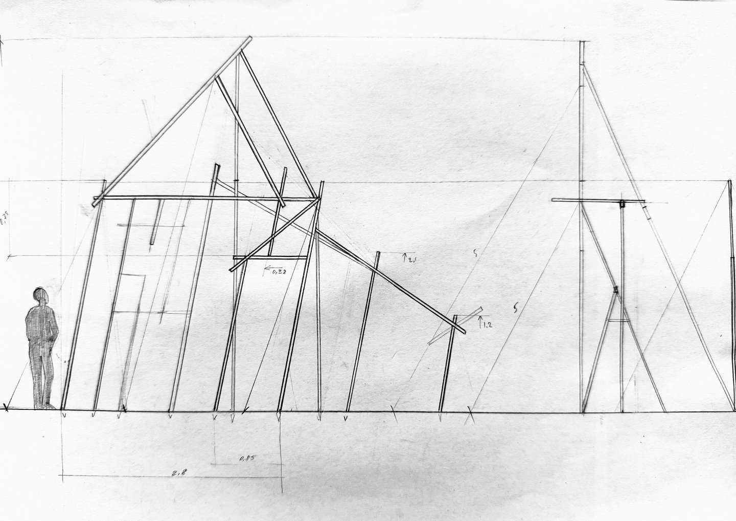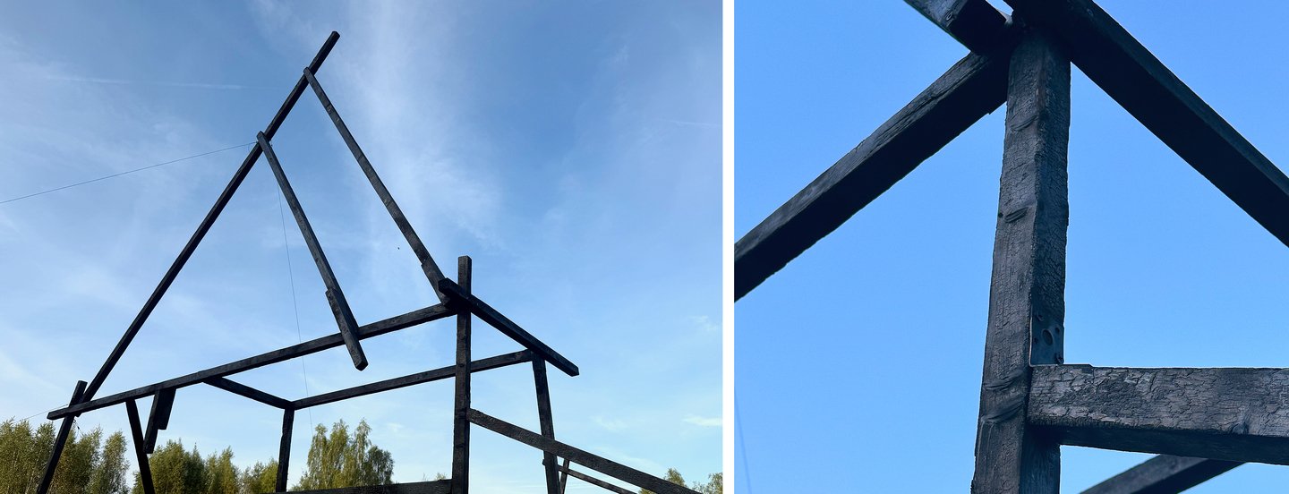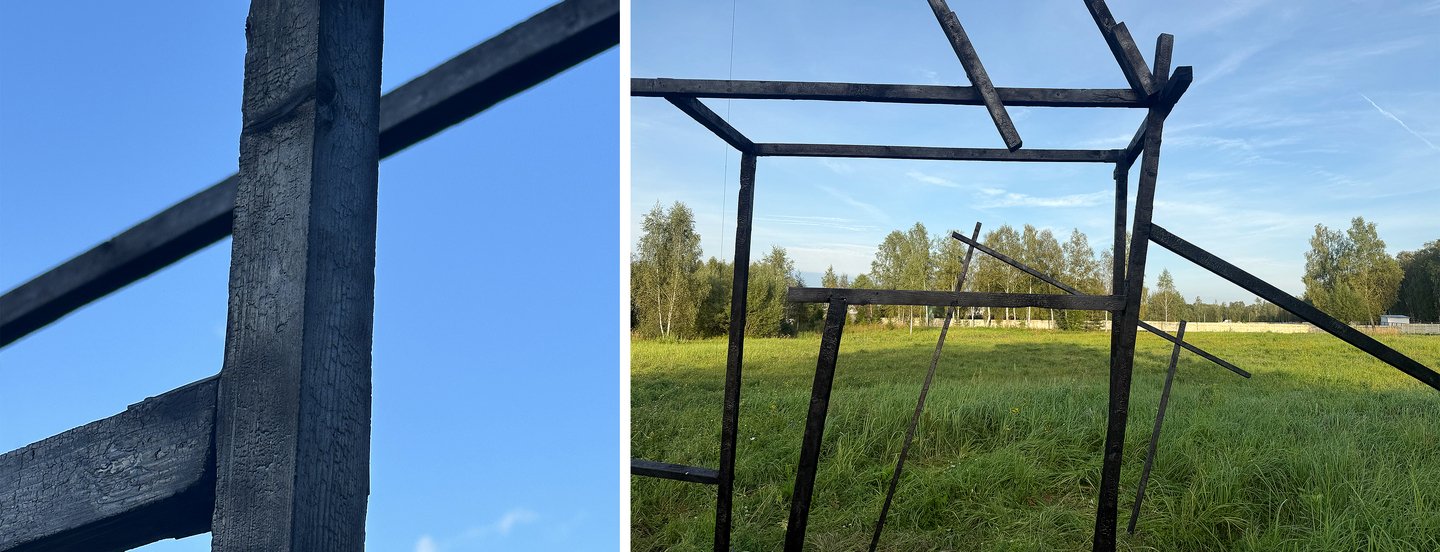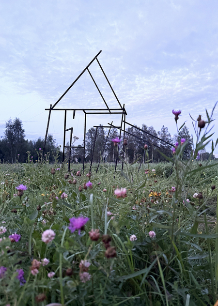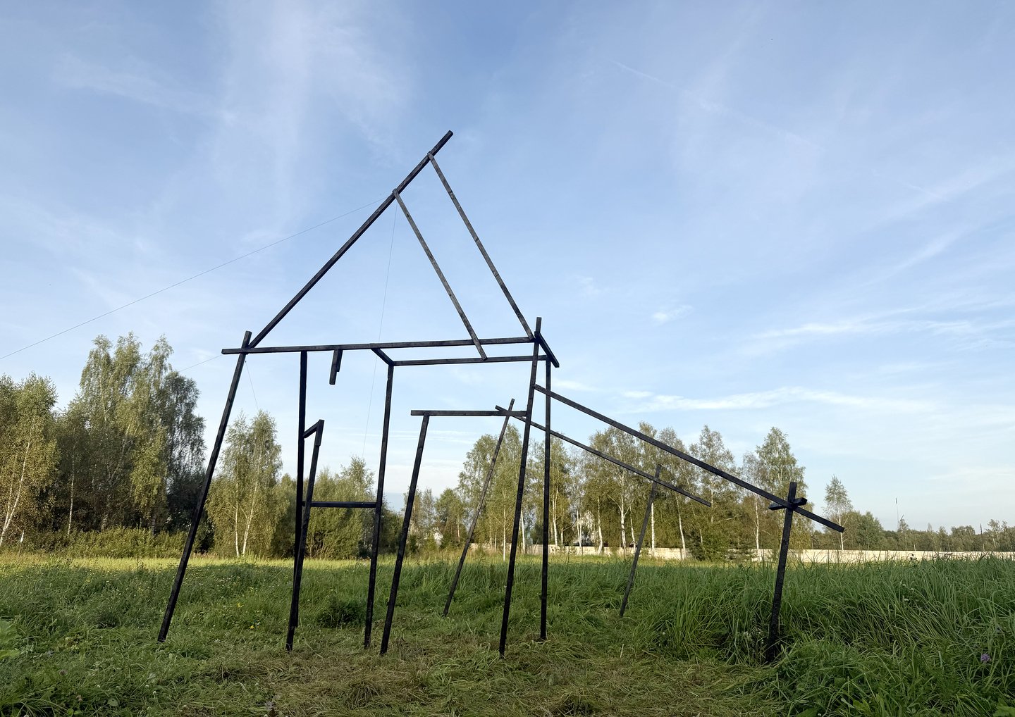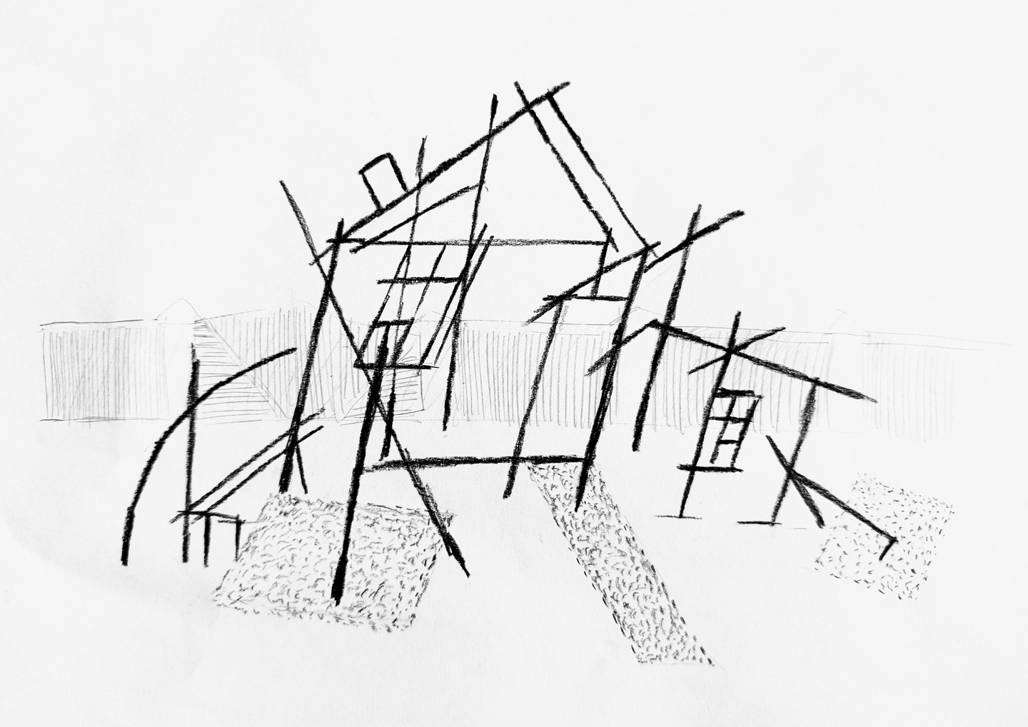 В контурах инсталляции угадывается абрис дома, но дом этот превратился в набросок будто бы сделанный в пространстве грубой черной линией. Порой нам кажется, что мы отчетливо помним дом детства во всех деталях, но стоит начать его рисовать этих деталей оказывается невероятно мало.