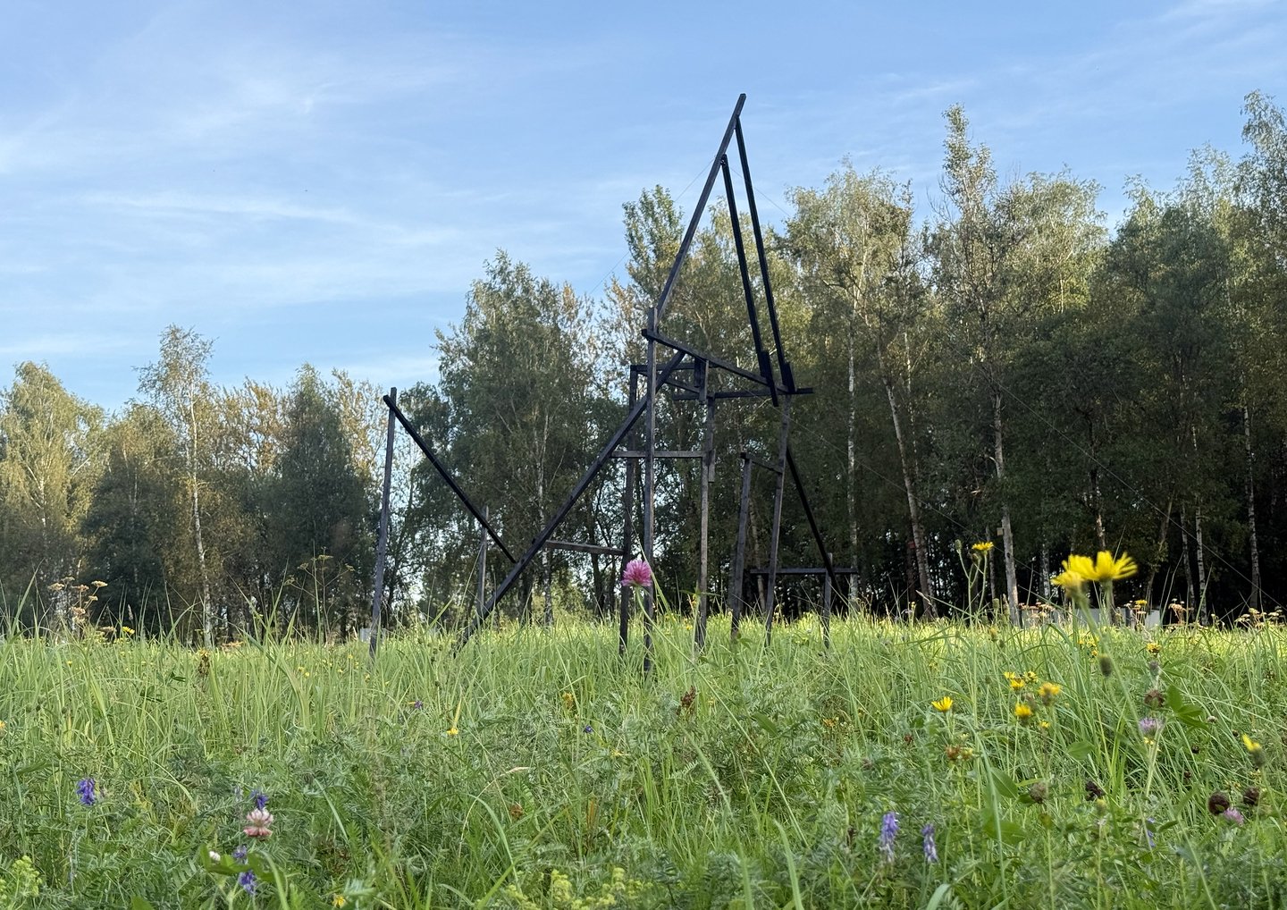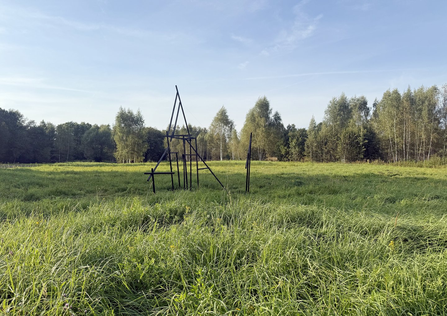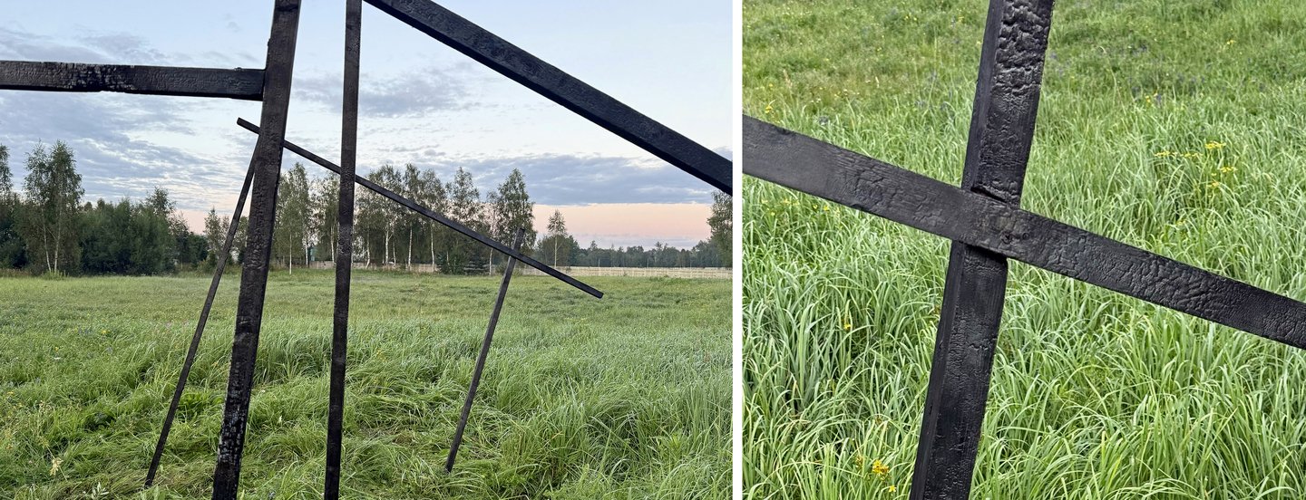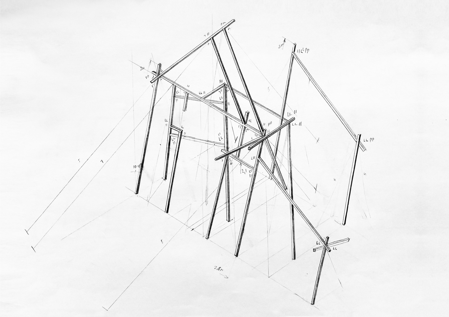 В контурах инсталляции угадывается абрис дома, но дом этот превратился в набросок будто бы сделанный в пространстве грубой черной линией. Порой нам кажется, что мы отчетливо помним дом детства во всех деталях, но стоит начать его рисовать этих деталей оказывается невероятно мало.