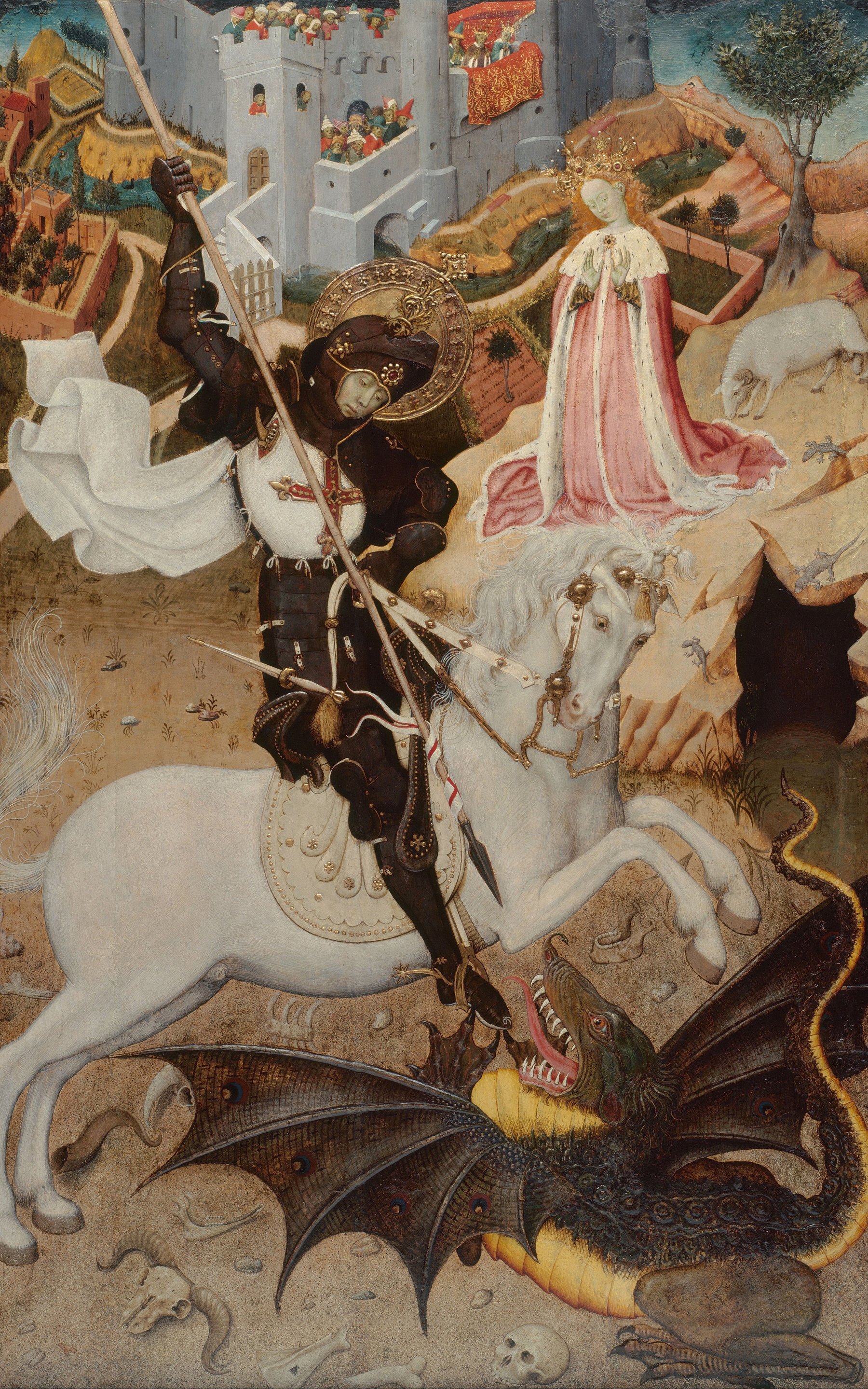 «Святой Георгий и дракон» (ок. 1434–1435) каталонского художника Бернара Мартореля — центральная панель алтаря для капеллы Святого Георгия в Барселоне (позже разделенного на составные элементы и ныне расположенного в Лувре). Это произведение демонстрирует мастерское сочетание декоративности интернациональной готики и нарративной динамики, отдавая дань символическому античному наследию относительно телесности, поз, композиционных систем и идеалу христианского рыцарства — богоугодной борьбе с великим злом.
