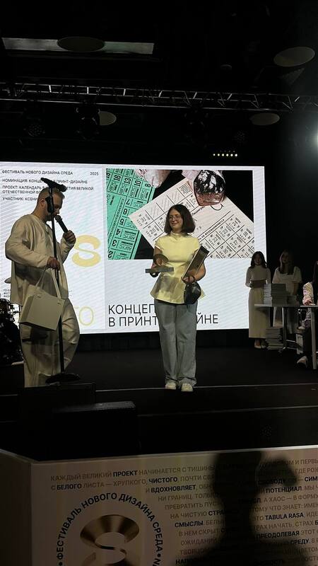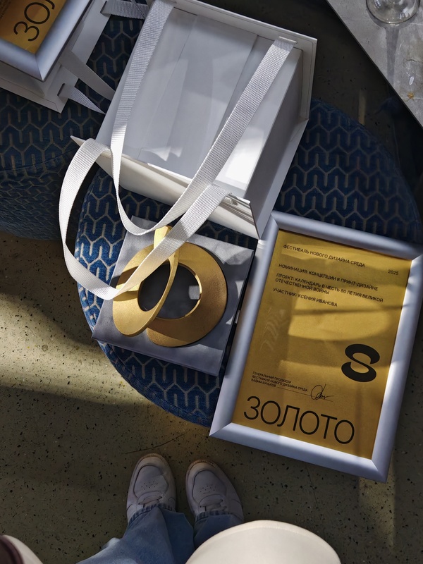 Результаты проекта превзошли все мои ожидания. Концепция календаря нашла отклик у аудитории: он был высоко оценён как в портфолио, так и на фестивале нового дизайна «Среда», где получил золотую награду.