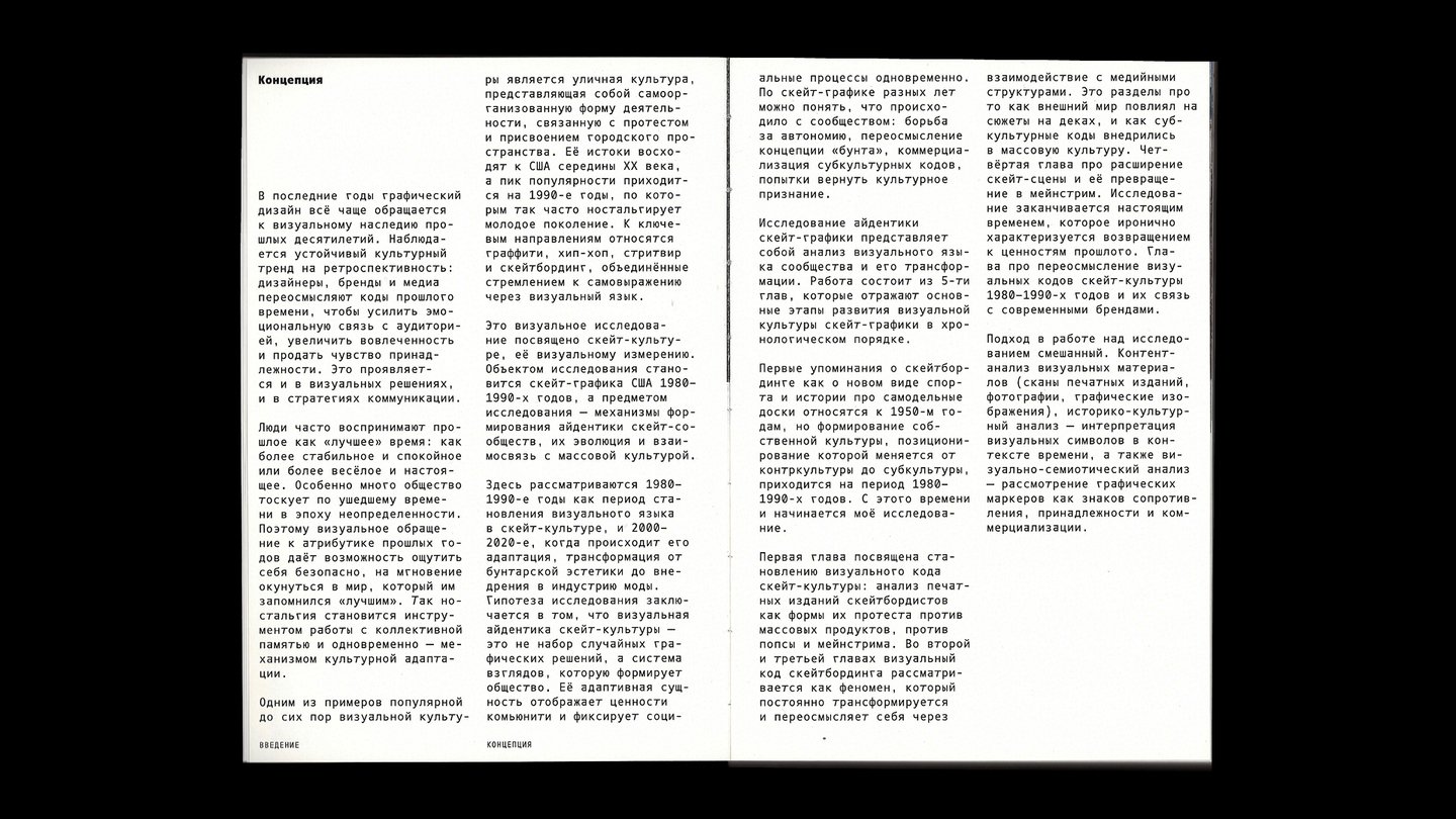 исследование рассматривает визуальную айдентику скейт-культуры как систему взглядов, которую формирует общество. цель работы — доказать что графика вокруг комьюнити адаптивна в зависимости от ценностей комьюнити и социальных процессов вокруг.